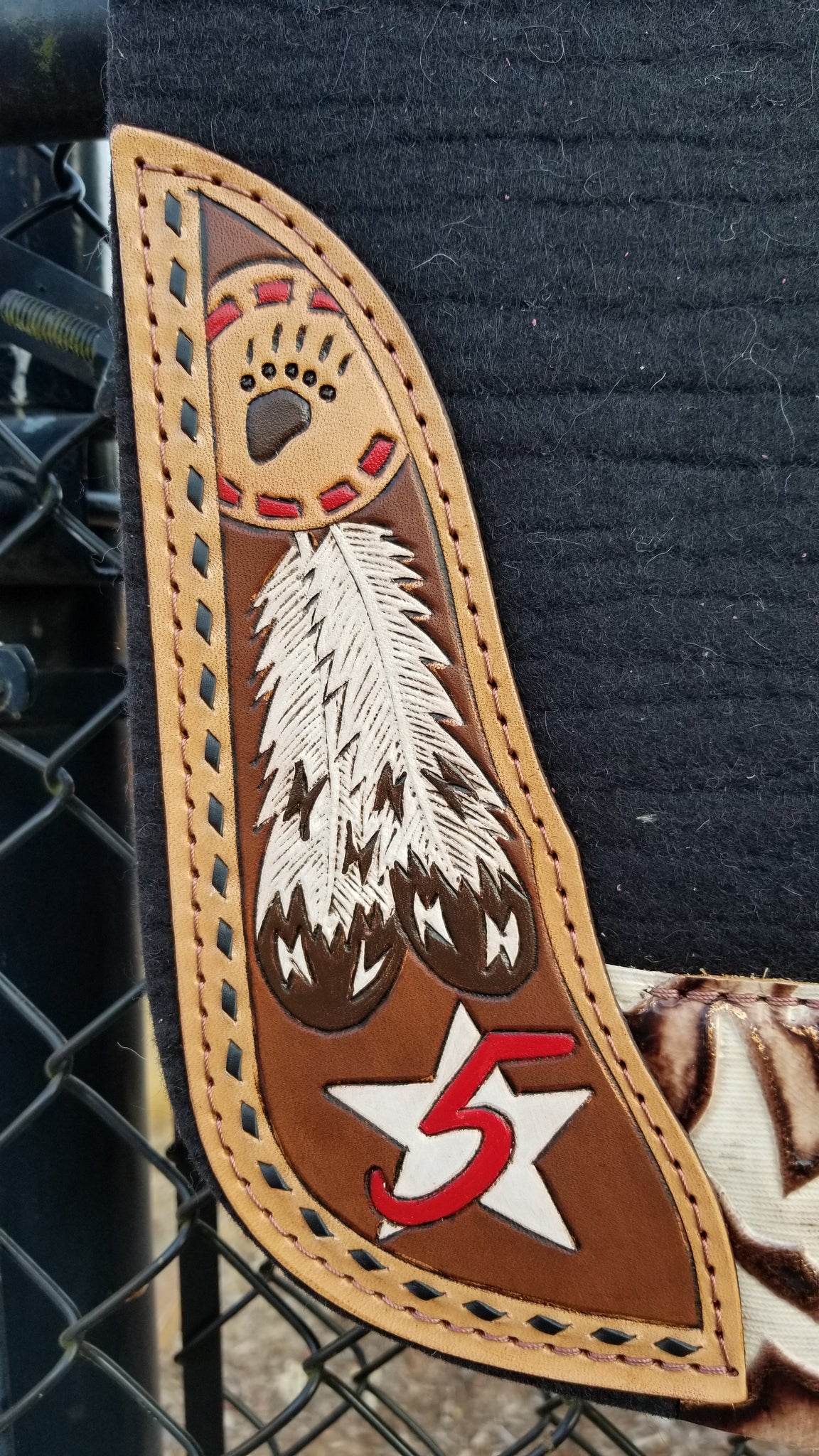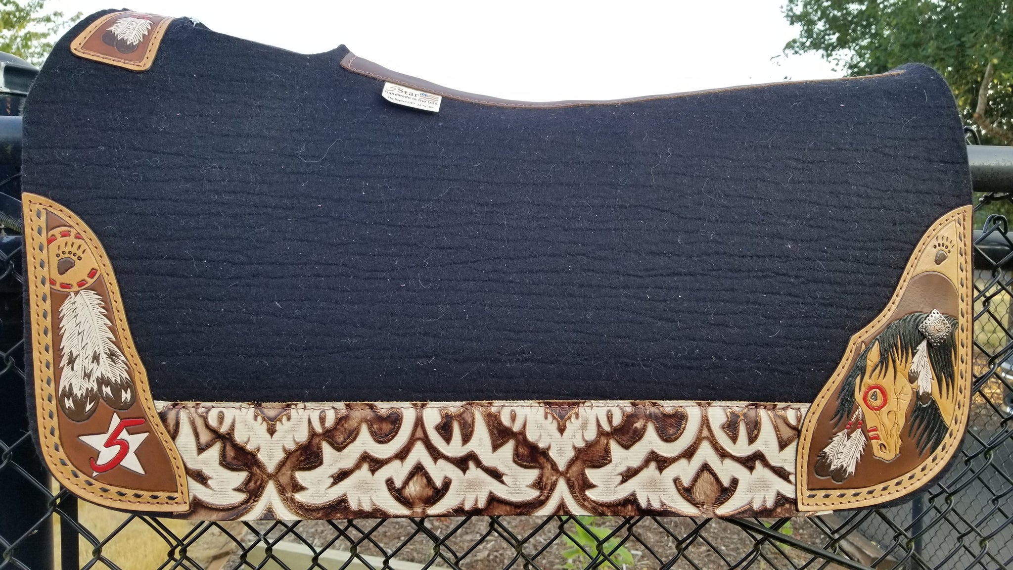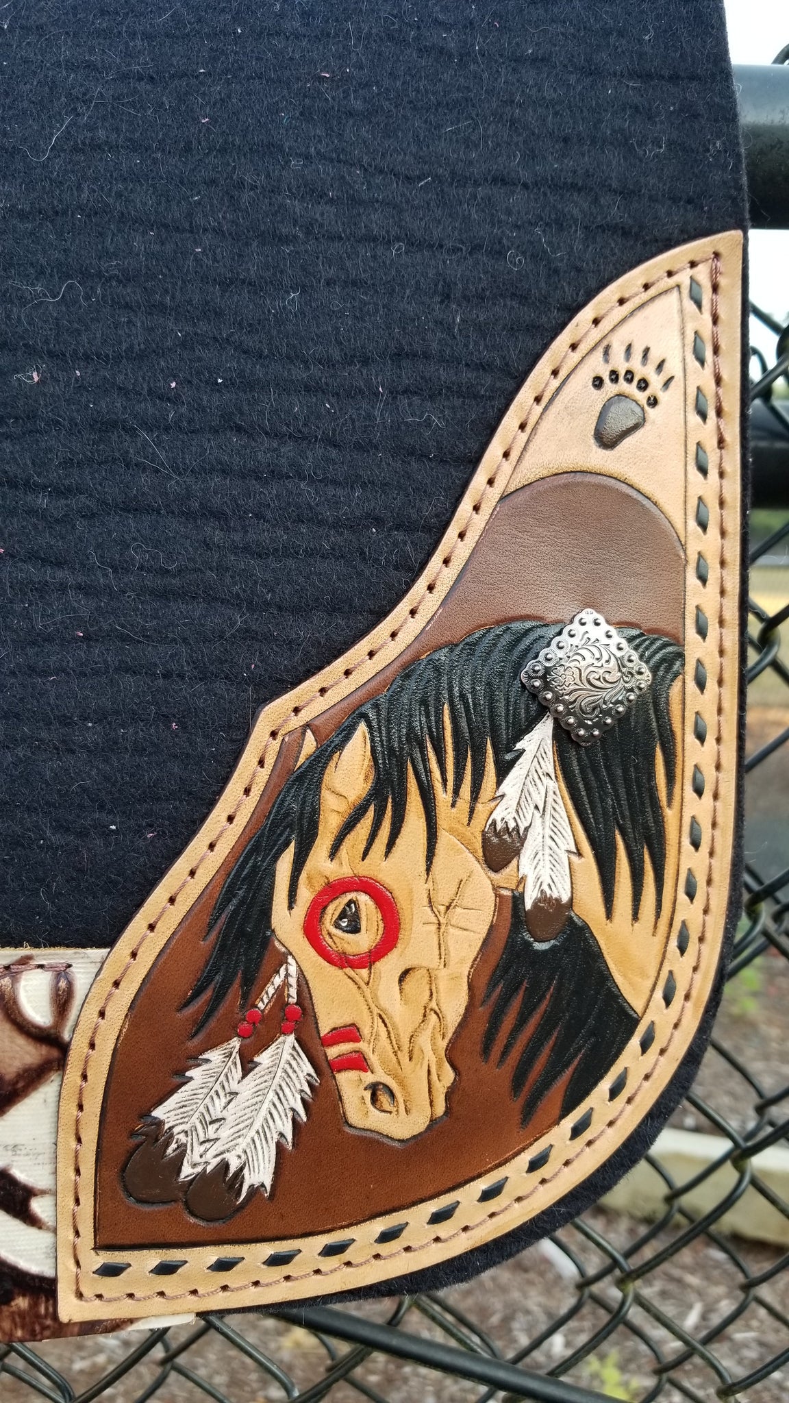 Black pad with Ivory Laredo wear leathers with hand tooled and hand painted corner plates.