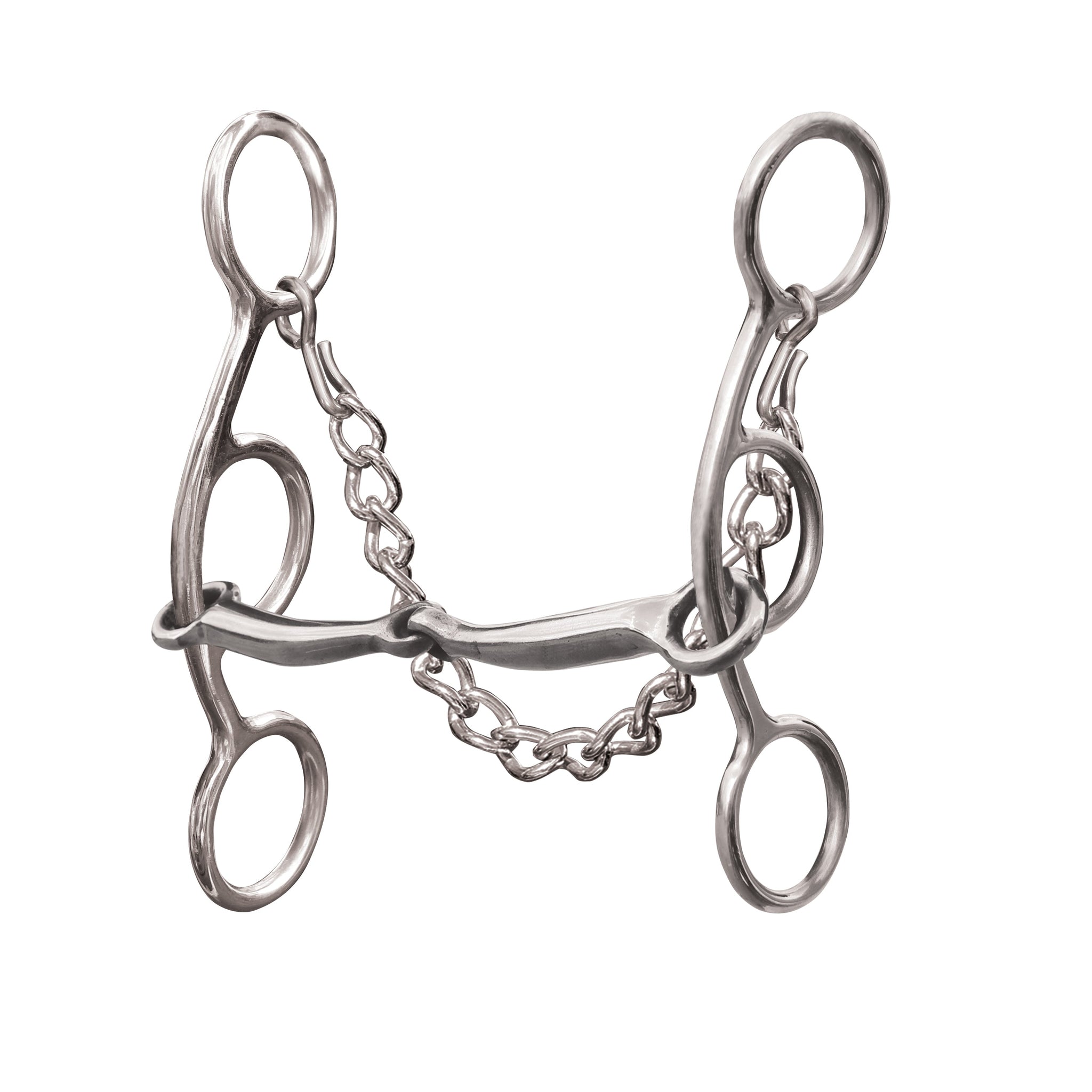 This is a good bit for the young horse who is ready to be transitioned from a snaffle to a shank bit. The short gag action allows the rider to pick up a horse when needed, allowing for greater control.