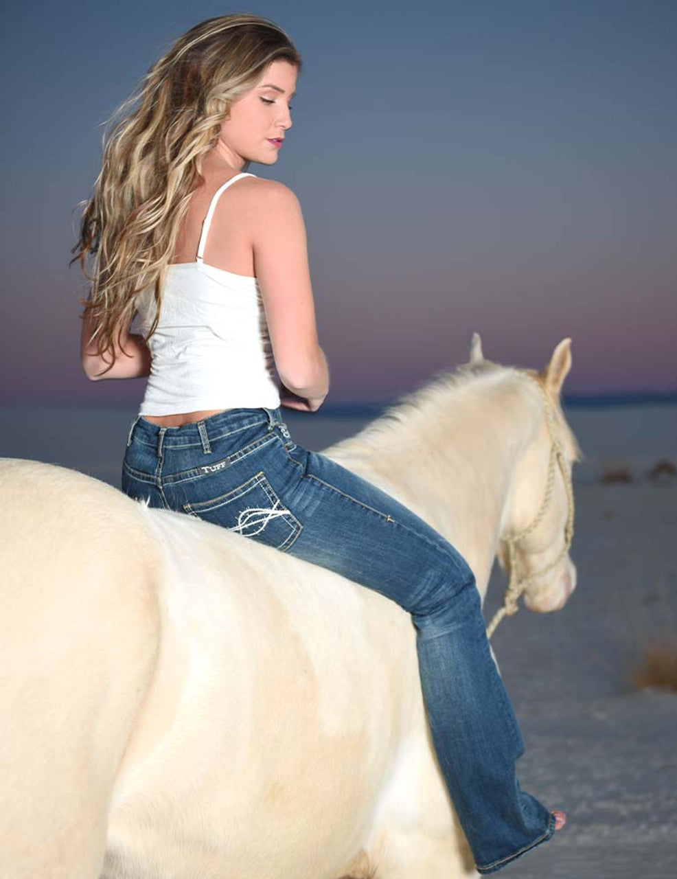 The Original "Don't Fence Me In" Jean is designed for ultimate comfort using only the best premium 12oz denim with 2% spandex for just the right stretch without bagging out. They give in all the right places while holding firm to your curves. This premium stretch denim is so soft on your skin but also tuff as nails when you need to work in them. The patterning of this "UnBelievable Fit" was created for the perfect fit whatever your size, with every waist increase the back rise increases to give you more coverage where you need it. This very popular western inspired jean is a mainstay and if you've never worn Cowgirl Tuff Jeans this is a great jean to start with. It has a dark wash with just the right amount wearing to either ride horses all day or go out for a night on the town. It has a simple cream, tan & brown overall stitching that is perfect to match up with any outfit and of course the back pockets have our signature barbwire. You will love how you look and feel in this great style. You will understand why Cowgirl Tuff Jeans are so popular in the rodeo arena, out on the trails and for everything you do in a day. They are built to last with a high quality zipper, 5 pockets, deep front pockets, reinforced side stitched seam with our trademarked T and also comes with an extra screw on button just in case. Yes they are a tuff tool for all your hardworking gals out there but a really good looking tool you can dress up any time you want.