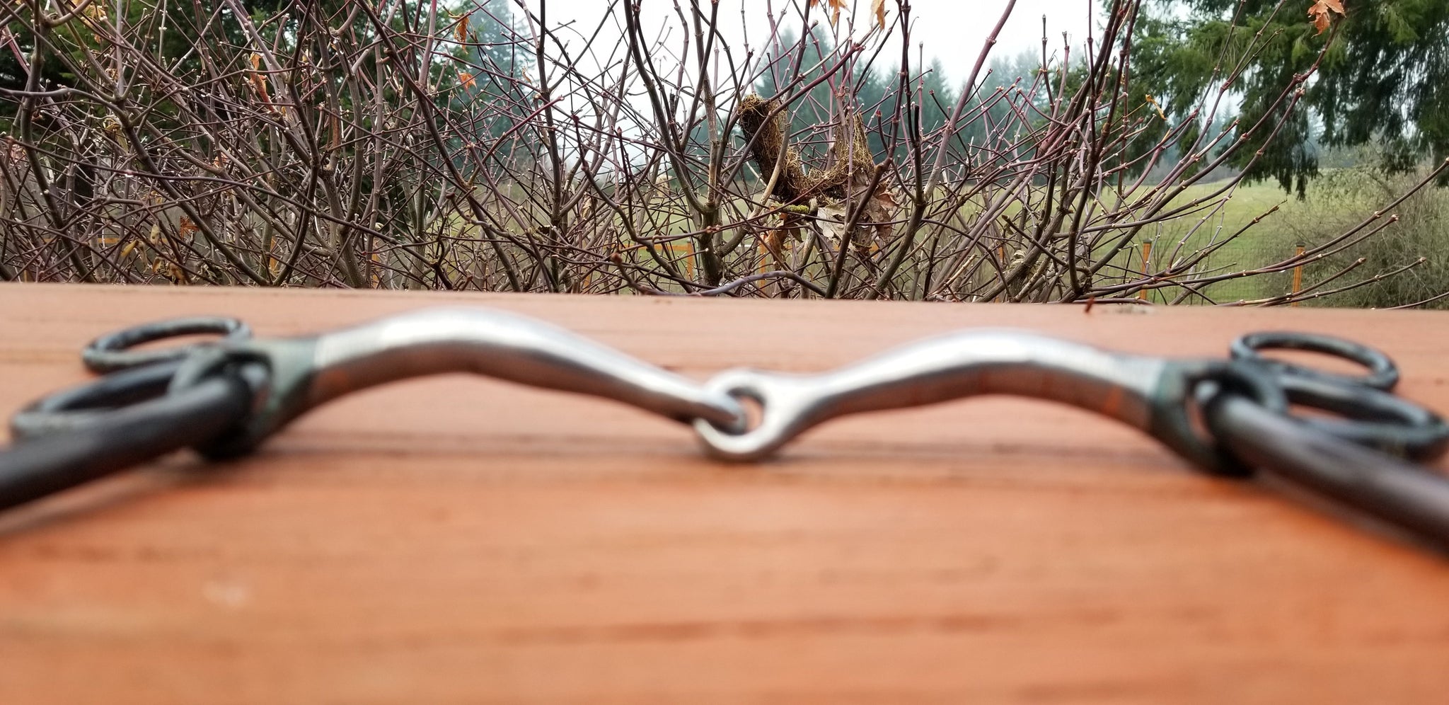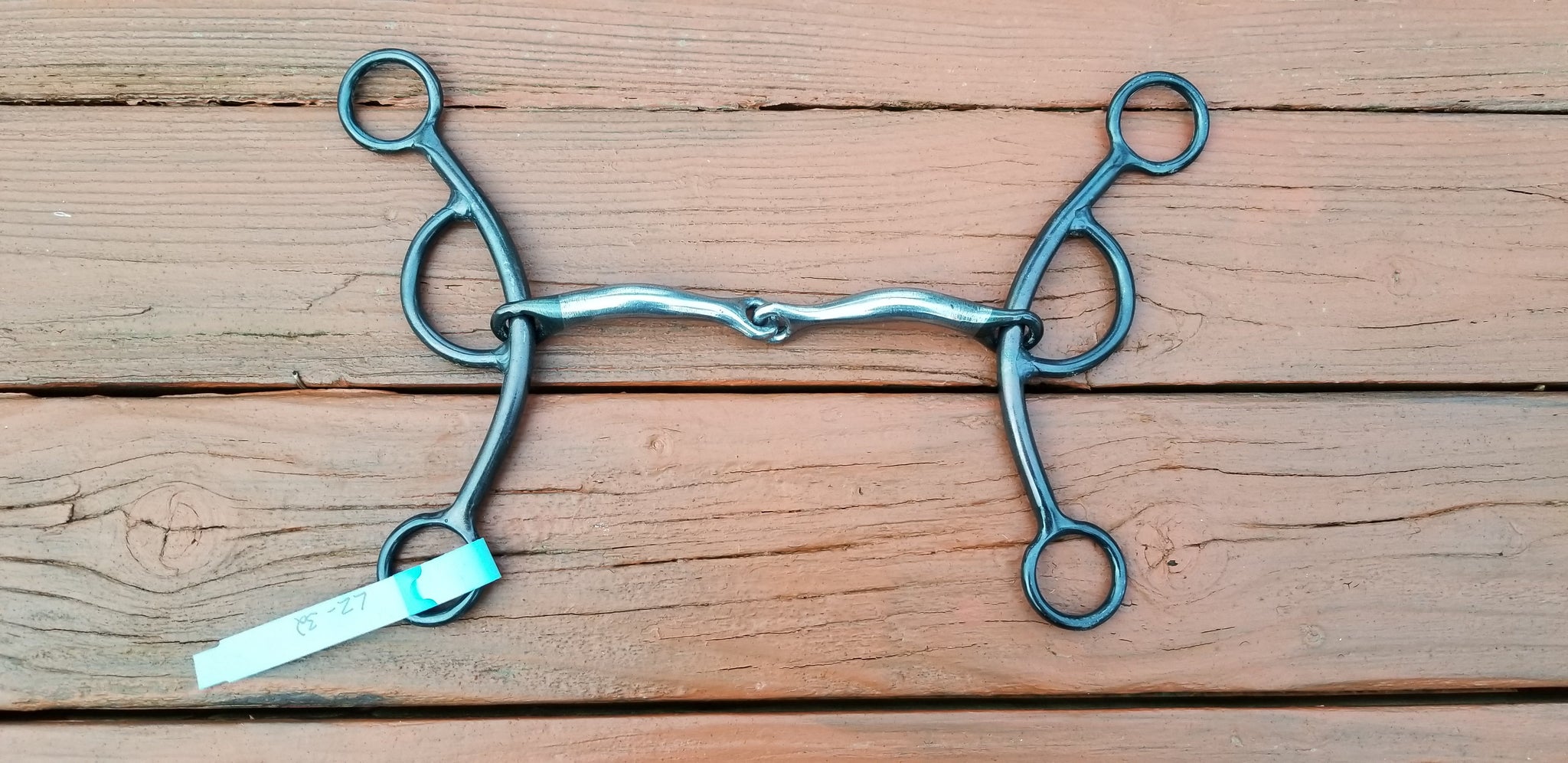 Mouthpiece 32: Smooth, two-piece copper inlayed mouth. Mouth piece tapers to the center and has slightly flattened mullen relief bars, allowing slightly more tongue relief than most two-piece mouth pieces. Light severity.