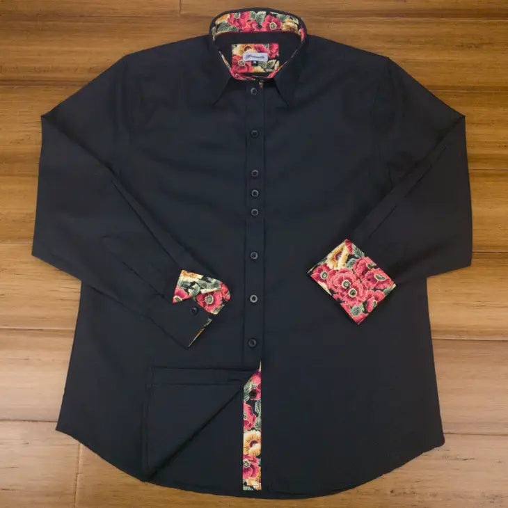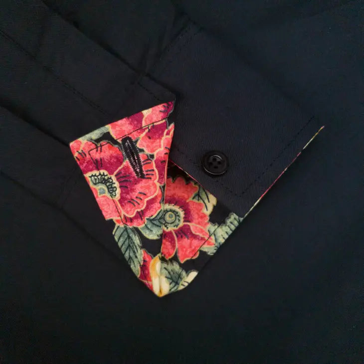 The deep black easy care micro twill fabric feels just wonderful against the skin and is a dream to iron, while the red and yellow poppy fabric inside the cuffs, collar and button placket, adds a splash of color.