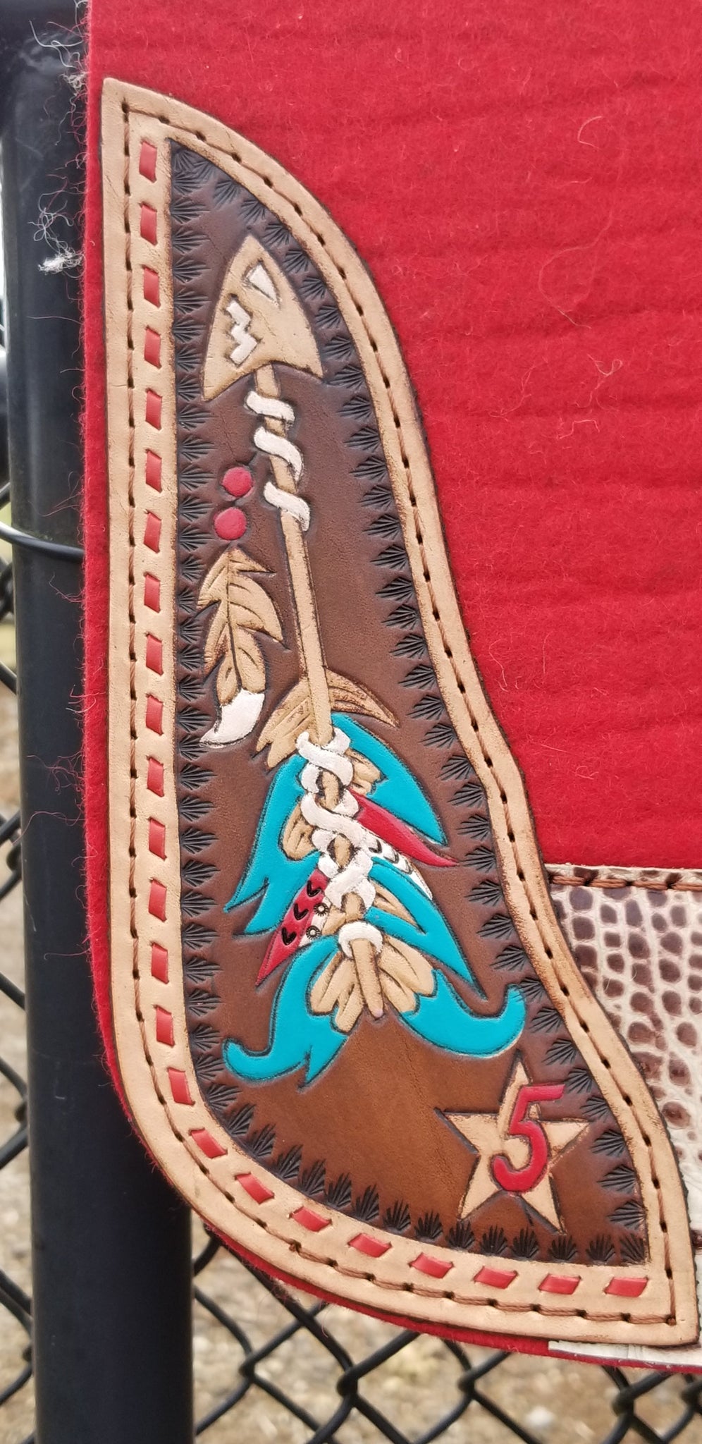 Red pad with ivory croc wear leathers and hand tooled and hand painted corner plates.