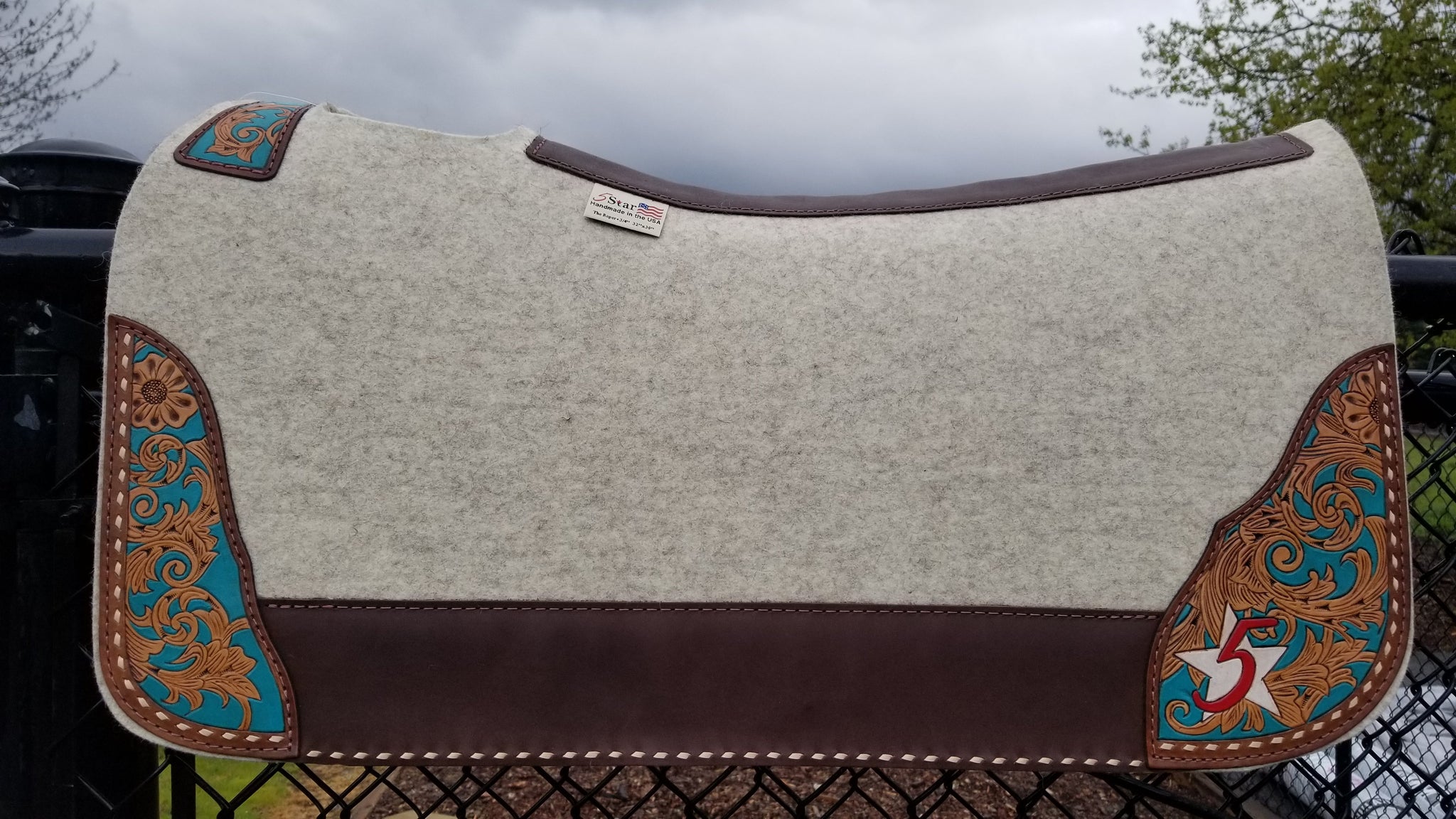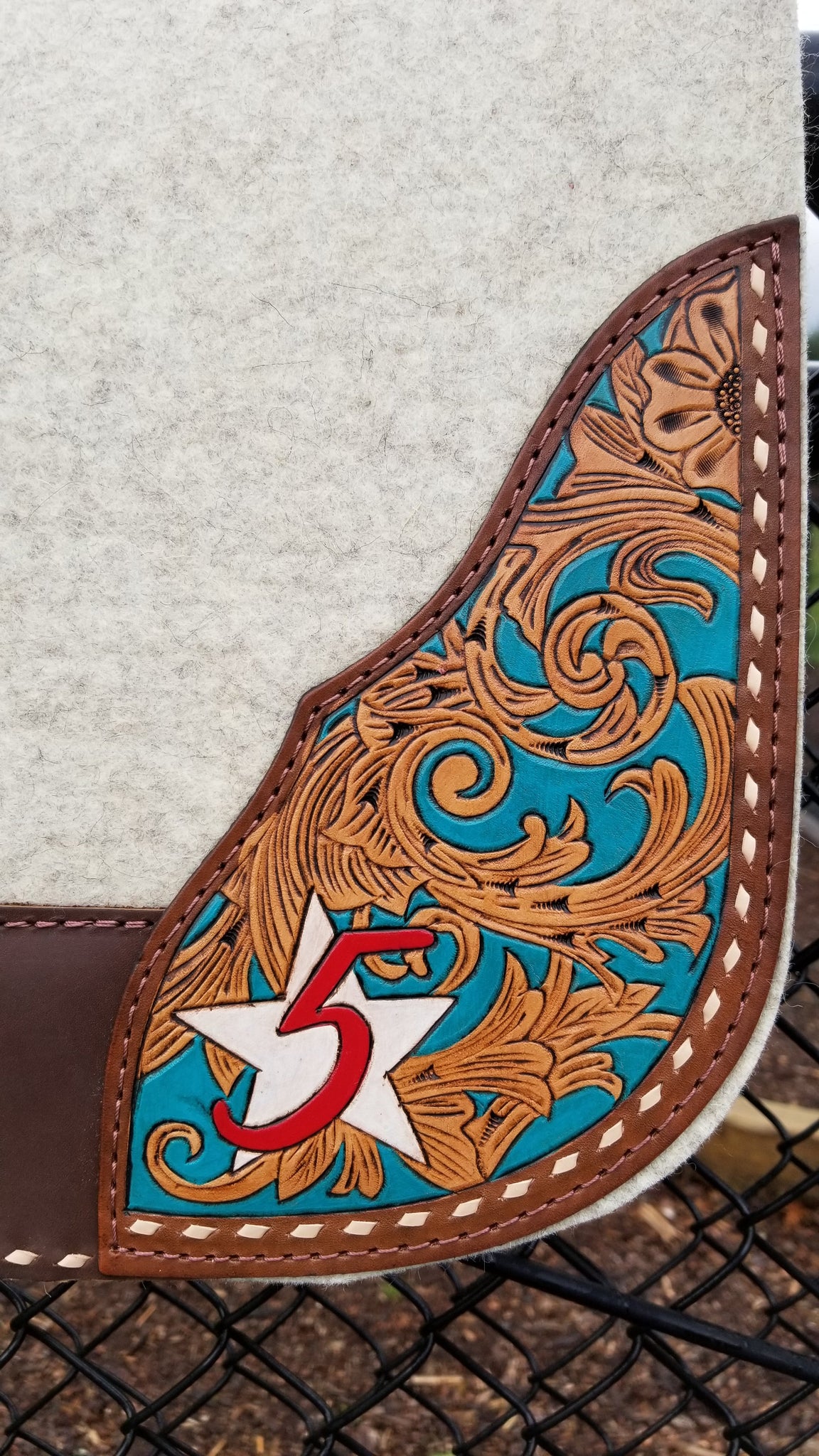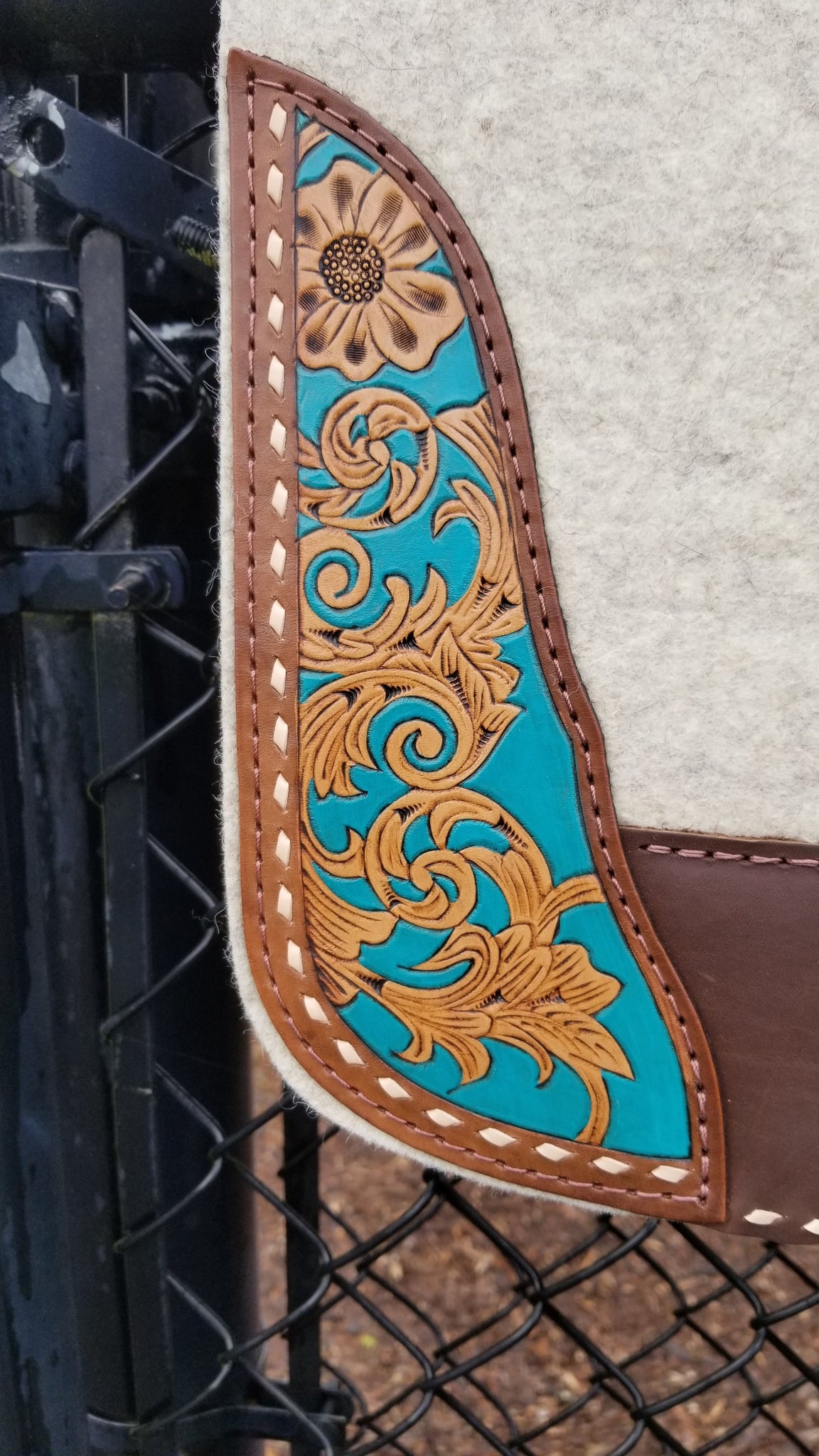 Natural pad with hand tooled and hand painted corner plates and buckstitching. Available with turquoise, red, black or purple paint.
