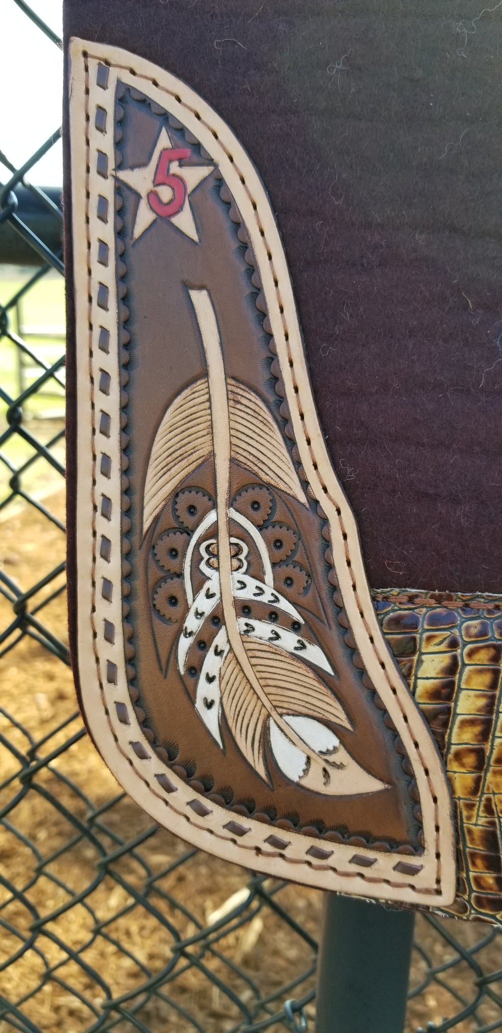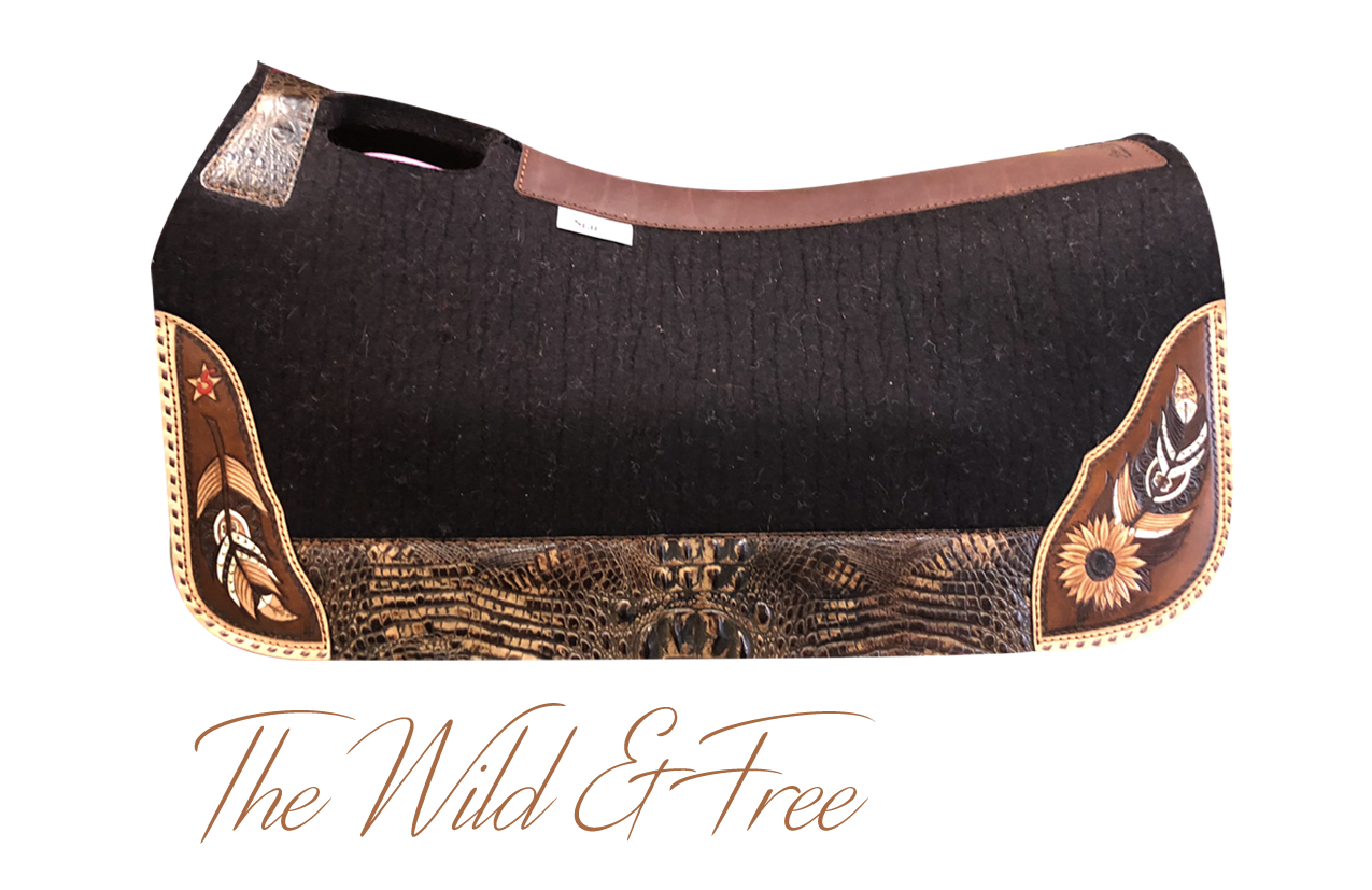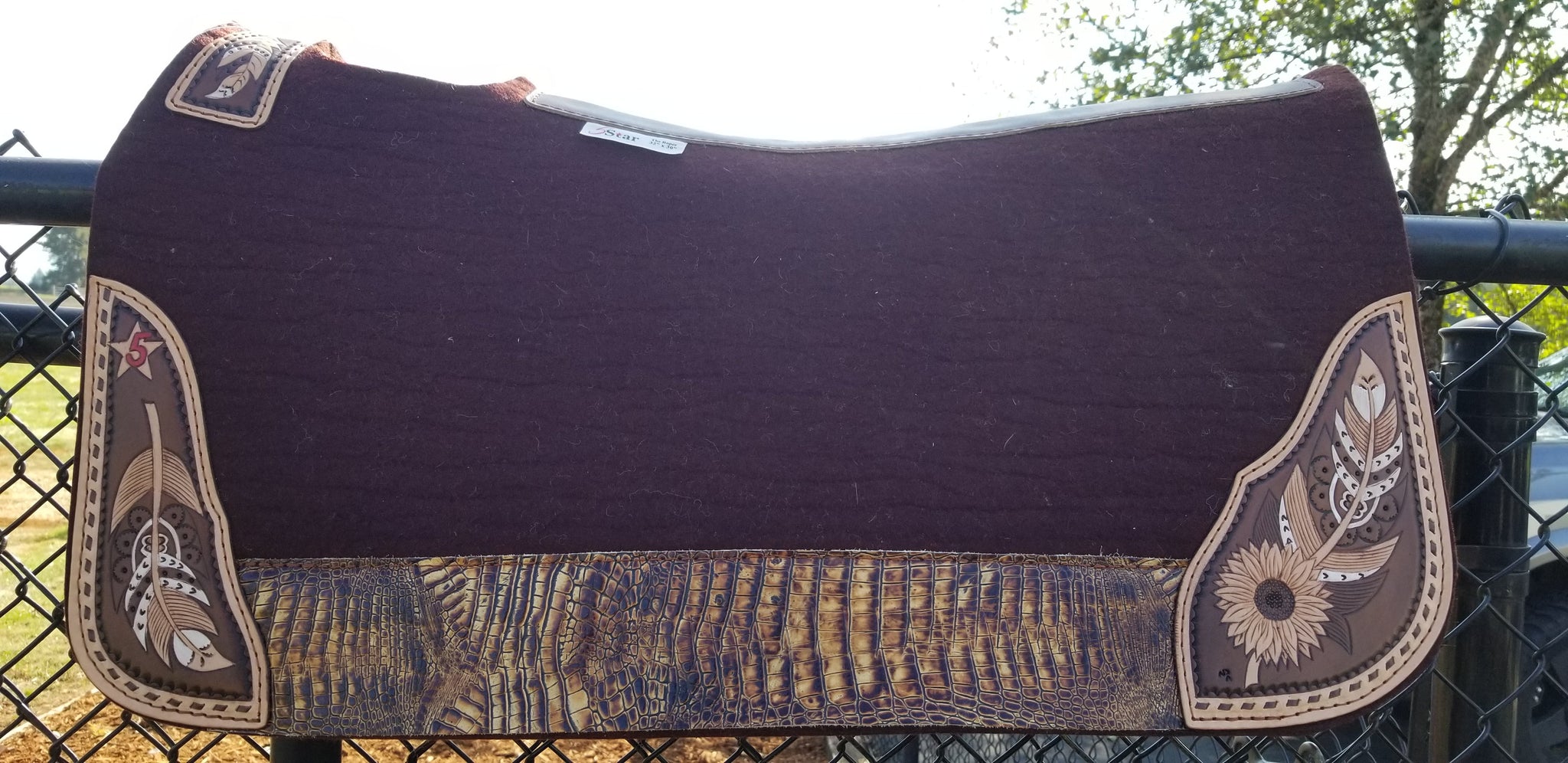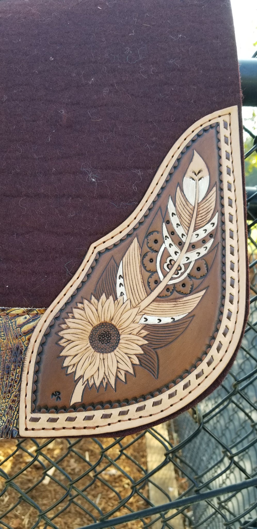 Chocolate pad with mocha croc wear leathers and hand tooled and hand painted corner plates.