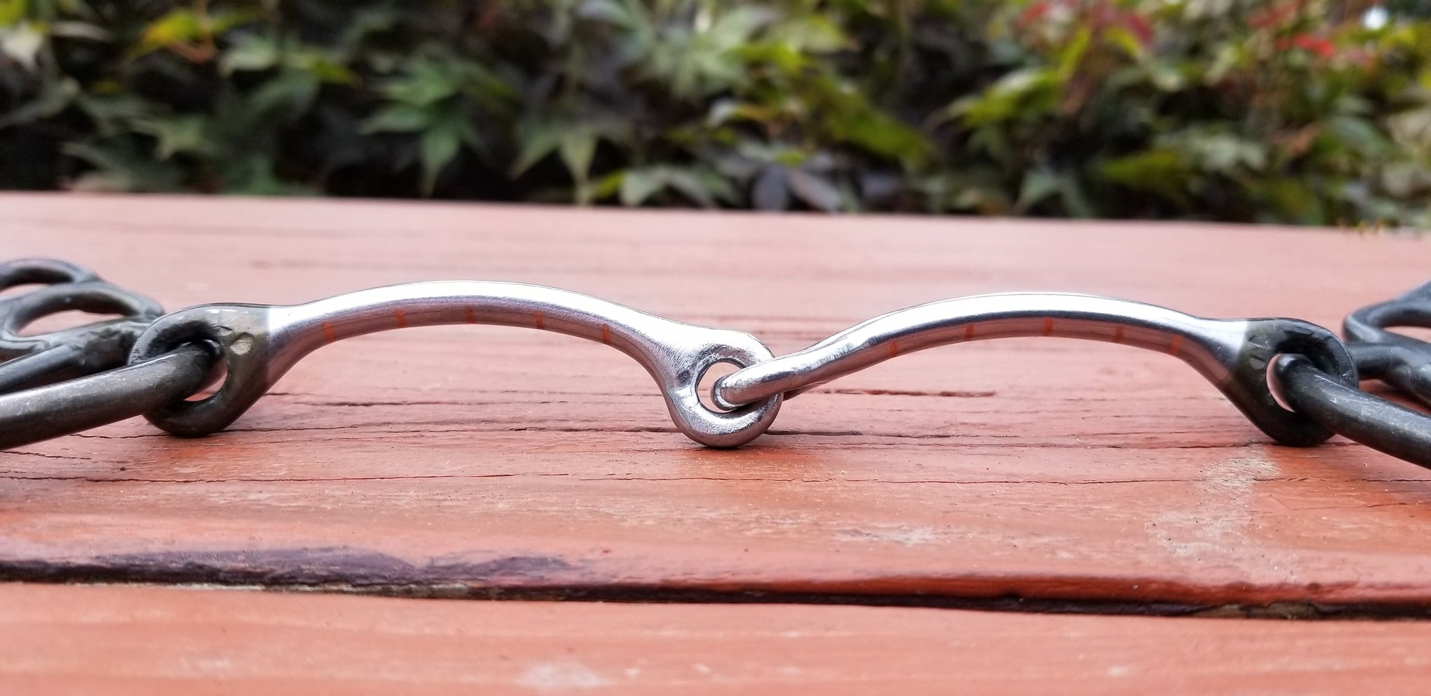 Two piece 1/4" copper in-layed mouth with mullen relief. This mouth piece carries a lot of collection for a two pice mouth, due to the small diamater of the bar piece. Medium to strong severity.