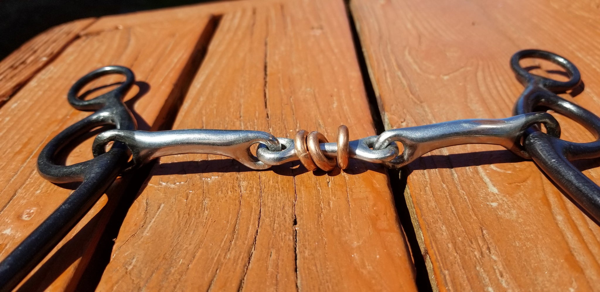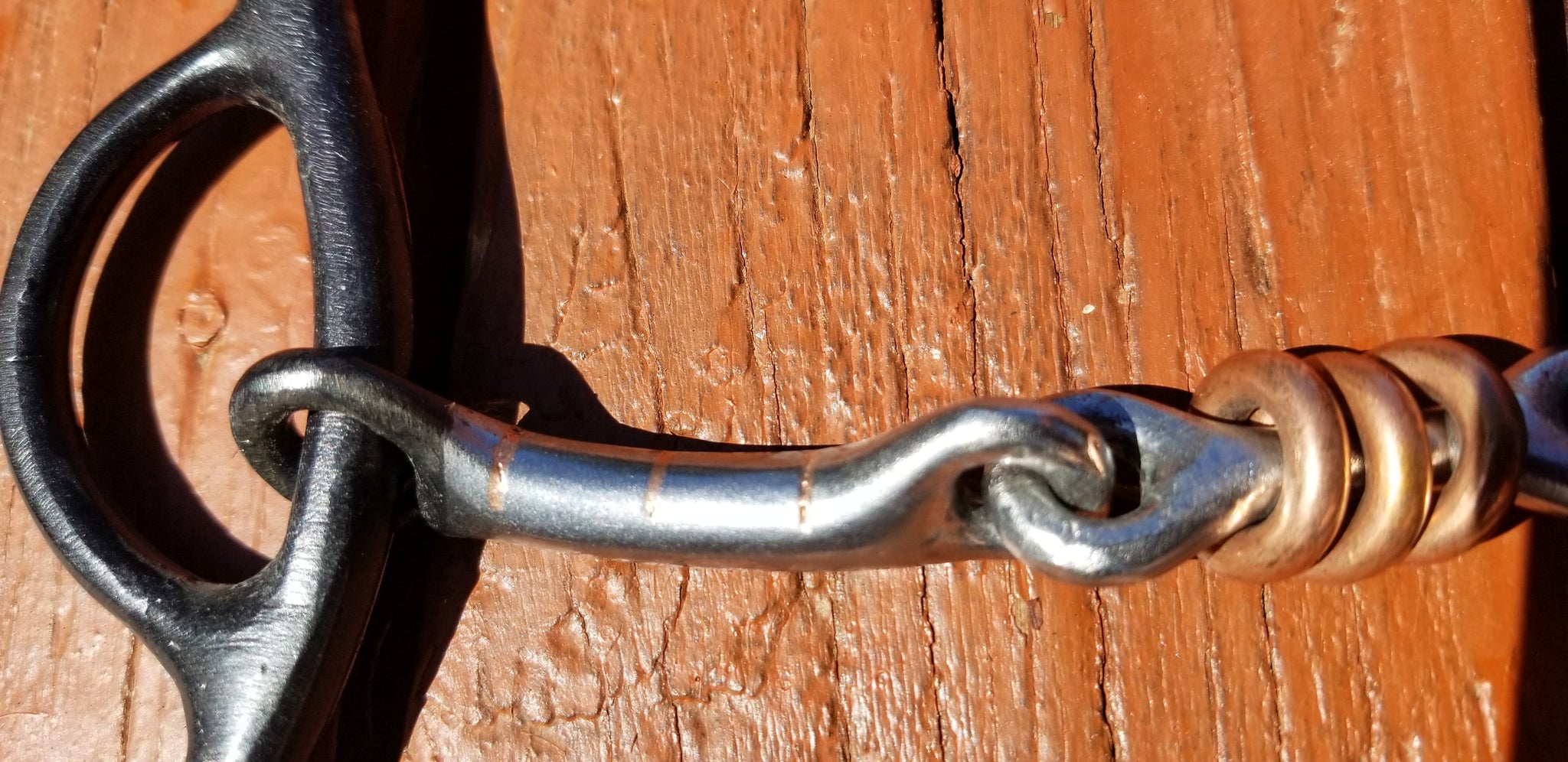 Mouthpiece 12: Light to medium severity. Three-piece mouthpiece, center piece has loose copper rollers and measures 1 ½”. Three-piece mouthpiece allows more bend than a two piece. It also allows more tongue relief. This mouthpiece works on the outside bar pressure points. Has copper inlaid bars.