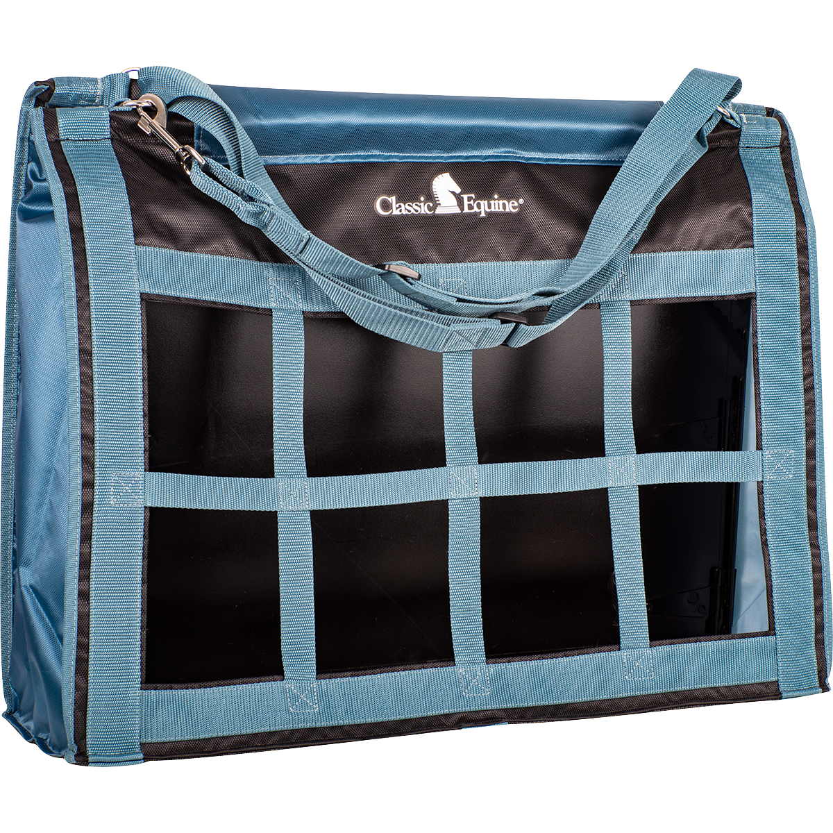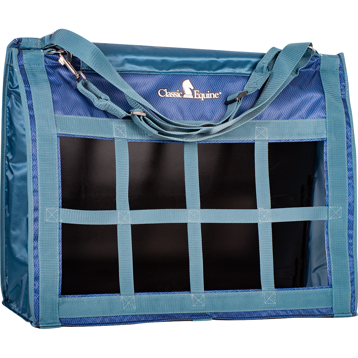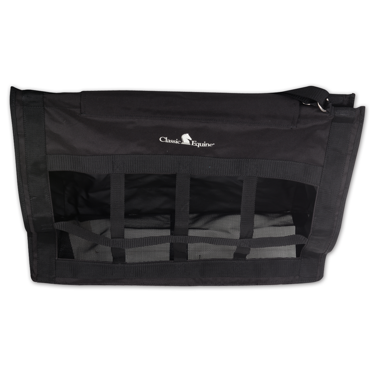 The Top Load Hay Bag opens wide, making it easy to fill and comfortably holds two to three large flakes of hay. Its top flap is designed to close securely and completely, which helps keep your horse from leaning in and pulling on the top of the bag. The front is constructed with tough, nylon-webbed squares that hold the hay securely and only allow the horse to pull small amounts at a time, which greatly decreases the amount of waste. The adjustable straps and quick snaps make it convenient and easy to hang virtually anywhere in the barn, in a stall, in the trailer or on the fence. Size: 24" x 20" x 9".
