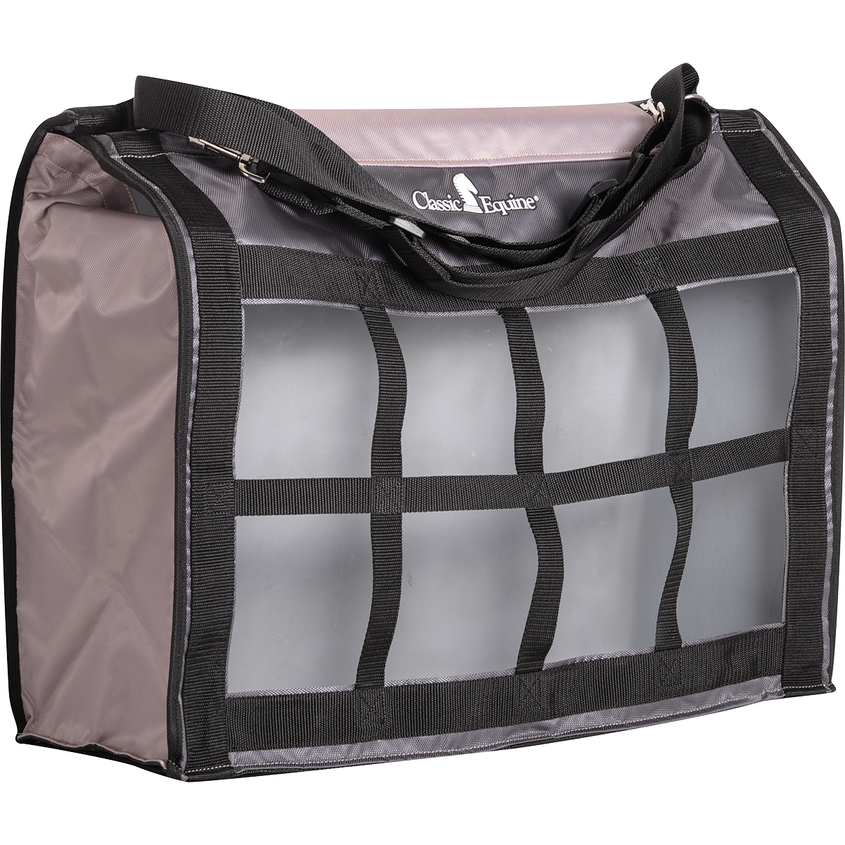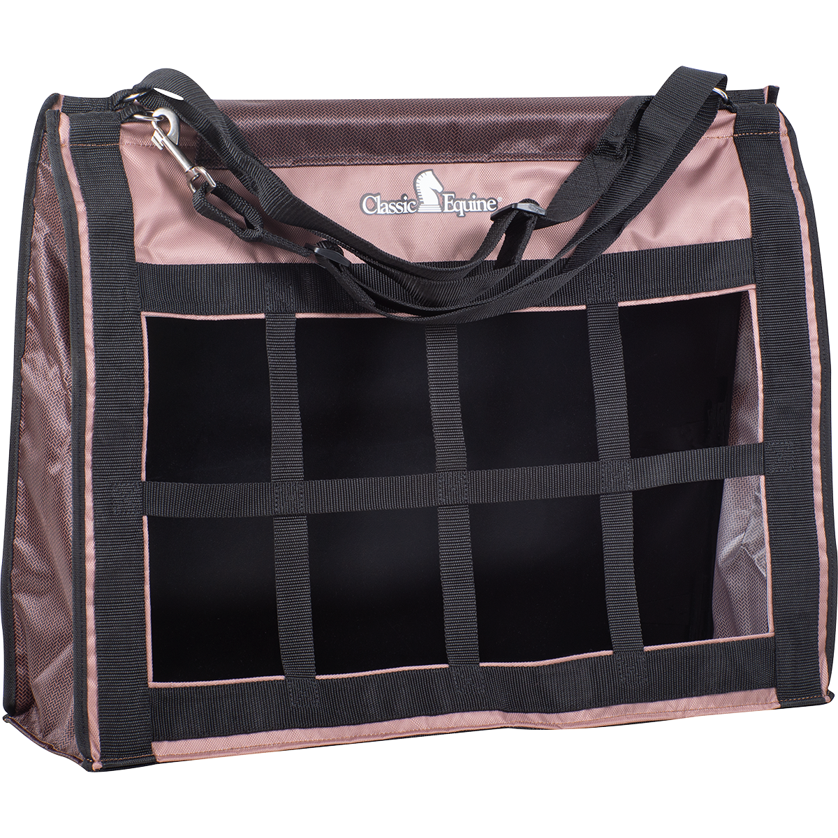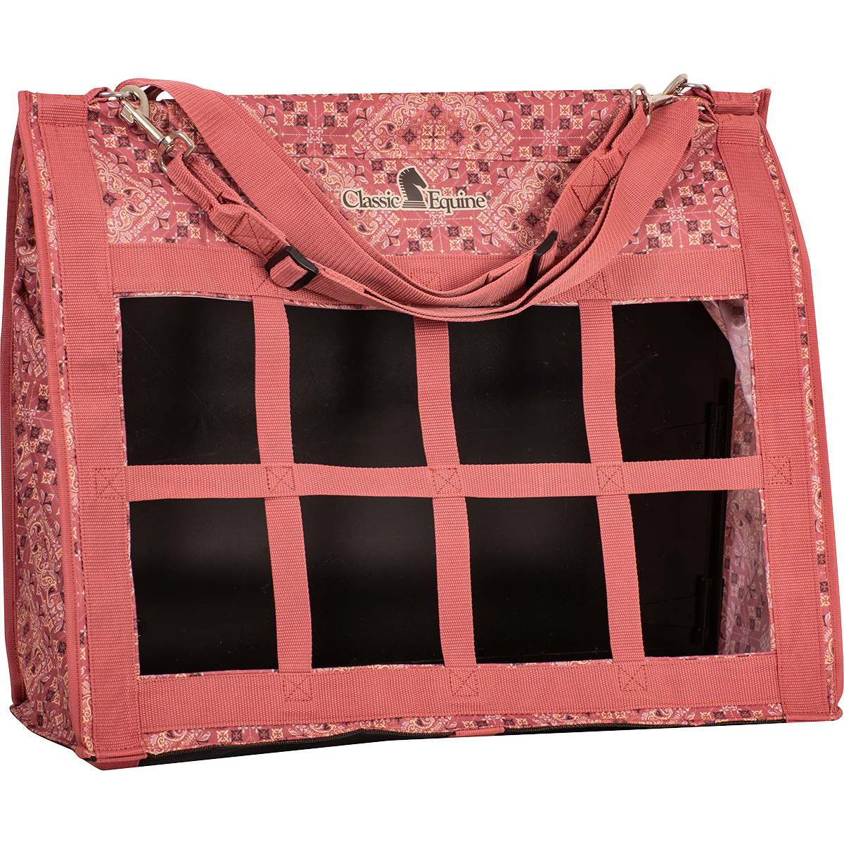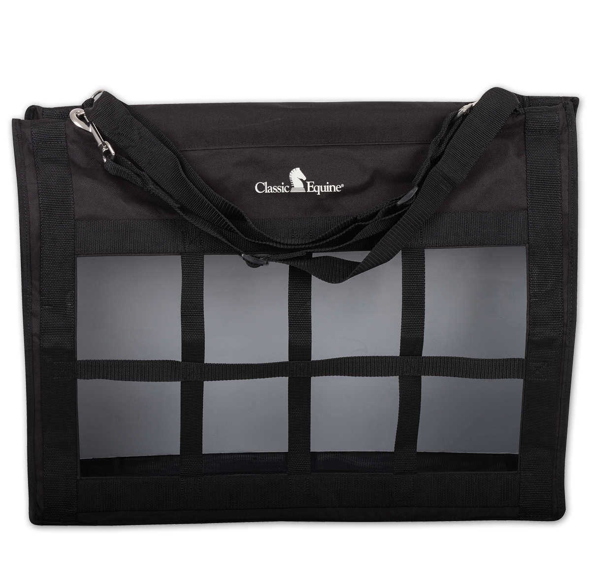 The Top Load Hay Bag opens wide, making it easy to fill and comfortably holds two to three large flakes of hay. Its top flap is designed to close securely and completely, which helps keep your horse from leaning in and pulling on the top of the bag. The front is constructed with tough, nylon-webbed squares that hold the hay securely and only allow the horse to pull small amounts at a time, which greatly decreases the amount of waste. The adjustable straps and quick snaps make it convenient and easy to hang virtually anywhere in the barn, in a stall, in the trailer or on the fence. Size: 24" x 20" x 9".